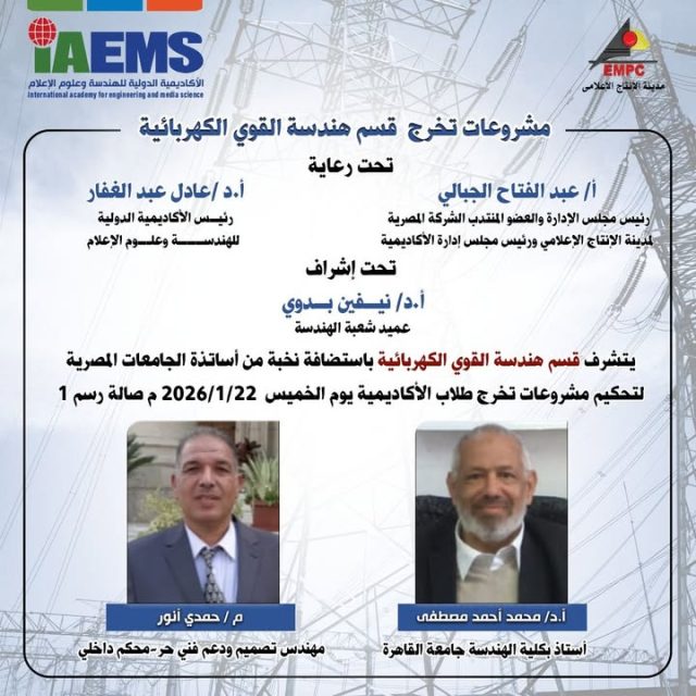 برعاية الأستاذ الدكتور/عادل عبد الغفار رئيس الأكاديمية والأستاذة الدكتورة/نيفين بدوي عميد شعبة الهندسة تم مناقشة مشروعات التخرج لبرنامج هندسة القوى والآلات الكهربية وقد تشكلت لجنة المناقشة والتحكيم من نخبة من الاساتذه والخبراء المتخصصين ، الأستاذ الدكتور /محمد أحمد مصطفى (أستاذ هندسة القوى الكهربية بجامعة القاهرة – محكماً خارجياً). الدكتور /شادي ممدوح صادق (دكتور بقسم هندسة القوى الكهربية – مشرفاً ومحكماً داخلياً). المهندس حمدي أنور (خبير التصميمات الهندسية الكهربية – مشرفاً ومحكماً).هذا وقد استعرض الطلاب خلال المناقشة مشروعاً انقسم إلى مسارين تقنيين: المسار الأول: تصميم الشبكة الكهربائية للبنية التحتية لمدينة صناعية ذكية، شمل تصميم محطة تحويل (66/22 ك.ف)، وتخطيط الموزعات والكابلات واختيار مهمات القطع والوقاية بدقة عالية. المسار الثاني: التصميم الداخلي لمصنع مواد غذائية، وتضمن منظومة الإنارة والقوى، واختيار المحولات والقواطع، بالإضافة إلى تصميم أنظمة الطوارئ (UPS والمولدات) لضمان استمرارية التغذية للأحمال الحرجة. أشادت لجنة المناقشة والحكم بالمستوى التقني والقدرة على ربط الجانب الأكاديمي بالتطبيقات الصناعية الحديثة ختامًا لمناقشة مشاريع تخرج قسم هندسة القوى الكهربائية.. شهدنا إبداعًا استثنائيًا يجمع بين النظرية والتطبيق، وأفكارًا مبتكرة تُظهر جاهزية مهندسينا الشباب لخوض غمار المنافسة في سوق العمل. تهانينا للخريجين وللمشرفين، ونتمنى للجميع مستقبلًا مشرقًا يضيء بتقنياتهم وابتكاراتهم. 💡