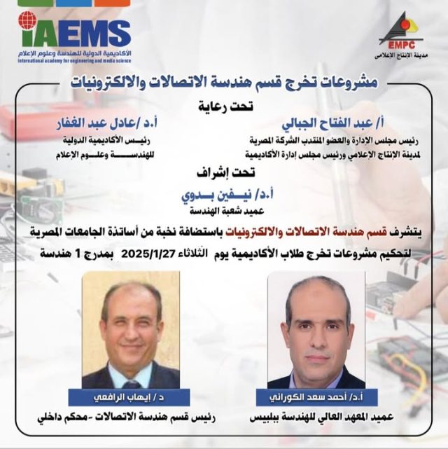 تحت رعايه الأستاذ الدكتور عادل عبد الغفار رئيس الاكاديميه الدوليه للهندسه وعلوم الاعلام والاستاذة الدكتورة نيفين بدوي عميدة شعبة الهندسة تم مناقشة مشروعات التخرج لبرنامج الهندسة المعمارية حيث قدم الطلاب 12 مشروعا متميزا مكنهم من التخرج بتفوق ، وهذه المشروعات تلبي متطلبات الدوله المصريه المعلنة ضمن خطه 2030 ومن أبرز هذه المشروعات مشروع العودة هنا تكتب الحكايه من جديد وهو خاص بإعادة اعمار غزة من خلال ثلاثة مشروعات حيوية ، ومشروعات الدولة المصرية مدينه البحوث العلمية ومركز علوم الفضاء والطيران ومنتجع الإستشفاء بالطب البديل في البحر الأحمر ومدينة العدالة في سيناء وميناء بحري دولي في طابا ومدينة السيارات فورميولا في العلمين الجديدة ومنتجع سياحي في جزيرة فرعون بالبحر الأحمر والمدينة الرياضيه الخدمية في العاصمه الجديدة ومركز تأهيل أطفال الشوارع بالقاهرة الكبرى أشرف على المشروعات أستاذ المقرر الدكتور محي الدين البطوط والمعيدة المهندسة بسنت اشرف وقام بالتحكيم الأستاذ الدكتور المعماري شريف العطار نائب رئيس جامعة الفيوم كممتحن خارجي والدكتور عزيز حسين كممتحن داخلي بالاضافة الى الدكتور محيى الدين البطوط مشرف قسم الهندسة المعمارية كما حضر المناقشات وشارك بها فريق برنامج الهندسة المعمارية الدكتور محمد عميره والدكتورة سمر السيد والدكتور تقي عابدين والمدرس المساعد المهندسه ميار مجدي تأتي هذه المشروعات للتأكيد علي أهمية دور القطاع التعليمي في تأهيل الكوادر للاستعداد لسوق العمل واستعدادهم العملي والمهني، مؤكدًا أن مشروع التخرج لم يكن مجرد متطلب دراسي، بل تجربة علمية متكاملة تعكس مستقبلًا واعدًا في مجال الهندسه المعمارية .