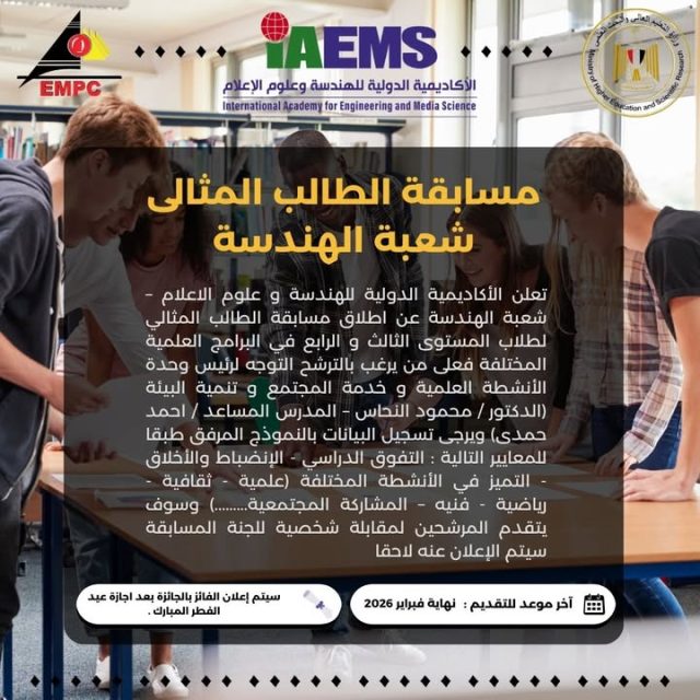 📣 إعلان هام للالتحاق بالفصل الدراسي الثاني 2025 / 2026 تُعلن الأكاديمية الدولية للهندسة وعلوم الإعلام عن إتاحة فرصة مميزة للالتحاق بالدراسة خلال الفصل الدراسي الثاني من العام الجامعي 2025 / 2026، وذلك للفئات التالية: طلاب الثانوية العامة الحاصلون على الشهادات العربية والأجنبية المعادلة خريجو دبلوم المدارس الثانوية التجارية خريجو المعاهد الفنية التجارية وذلك للطلاب الذين لم يلتحقوا بأي جامعة خاصة أو أهلية، ولم يتم ترشيحهم من خلال مكتب التنسيق. 🎓 الالتحاق متاح بإحدى الشعب التالية: -شعبة علوم الإعلام -شعبة هندسة الإعلام -شعبة إدارة الأعمال ⚠️ الأعداد المتاحة محدودة، والأولوية بأسبقية التقديم. 📍 مقر التقديم: مدينة الإنتاج الإعلامي – بوابة (4) مدينة السادس من أكتوبر – الجيزة – مصر 🕘 مواعيد العمل بمكتب شؤون الطلاب: من الأحد إلى الخميس | من 9 صباحًا حتى 4مساءً. 📞 للاستفسار والتواصل: 01027450802 01111015563 01027128402 01111566809 ☎️ أرضي: 0238555398